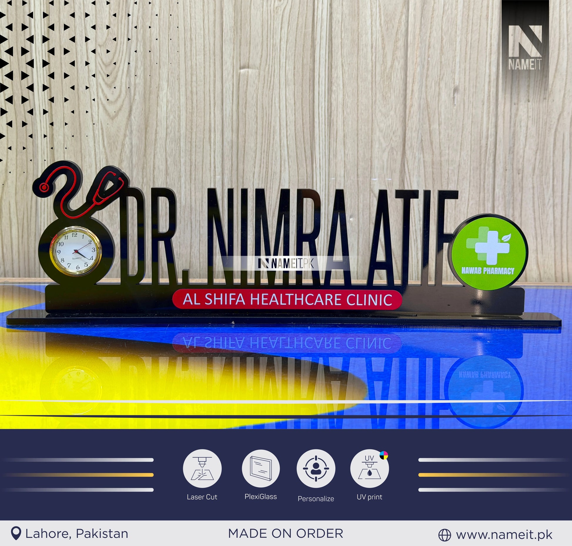 Elevate your professional workspace with this Personalized Acrylic Table Name Plate with Clock – a perfect blend of style, function, and customization. Crafted from high-quality black acrylic, this sleek desk nameplate features your custom name alongside a functional clock, making it an ideal desk accessory for any office or business setting.Designed to make a lasting impression, this custom nameplate with clock is perfect for: